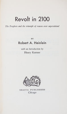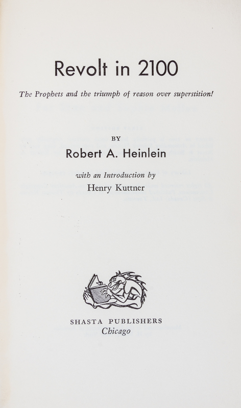 Revolt in 2100: the prophets and the triumph of reason over superstition! Chicago: Shasta Publishers, 1953. First edition, signed. Cloth boards (21 cm. tall), with price-clipped jacket showing minor discolouration. Signed by Heinlein on preliminary leaf, following chronlogical endpapers.