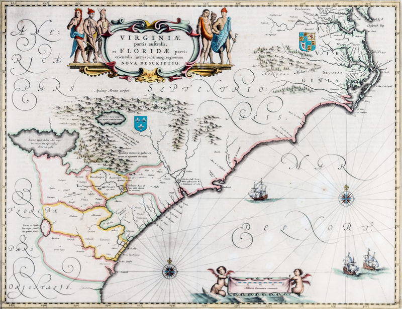 Virginiae partis australis, et Floridae partis orientalis, interjacentiumqus regionum. Nova descriptio. Amsterdam, circa 1644.Hand-colored engraved map (40 x 51 cm., sight); matted and framed. With French text on verso. Depicting the Southeast as it extends from the southern part of Chesapeake Bay to Northern Florida. Improving on the Hondius map of 1606, with Chesapeake Bay correctly indicated as a large bay and the Carolinas and Georgian coasts depicted more accurately. Bar scale above the neat line on the lower margin with cartouche held by cherubim; left cherub with tail.