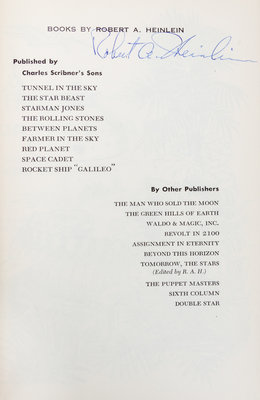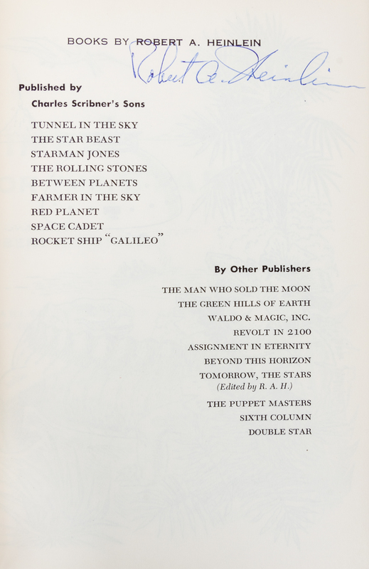 Tunnel in the sky. New York: Charles Scribner's Sons, 1955. First edition, signed.Decorative cloth boards (21 cm. tall), with fulll jacket, illustrated by P. A. Hutchison; modest wear to spine, otherwise in fine condition. Signed by Heinlein on preliminary leaf.