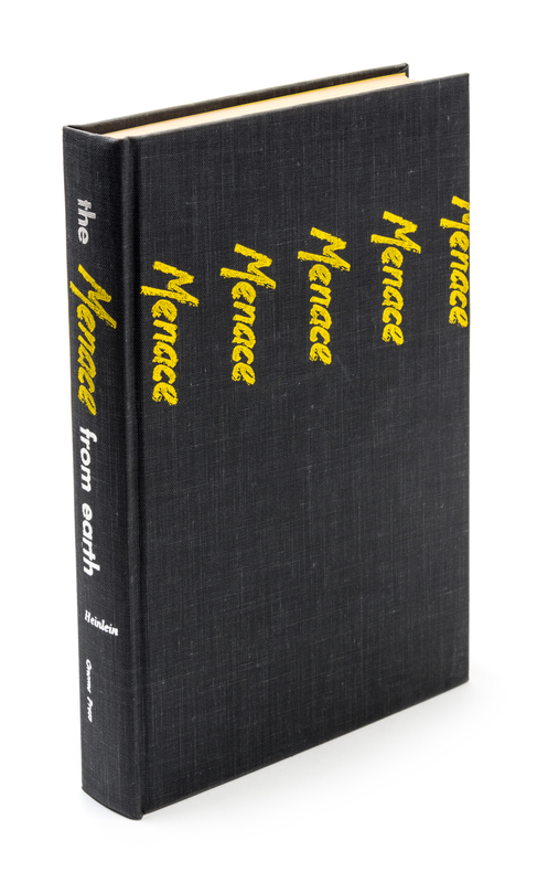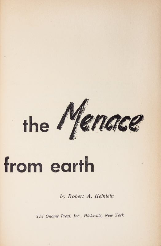 The menace from Earth. Hicksville, N.Y.: The Gnome Press, 1959. First edition. Cloth boards (21 cm. tall), with fulll jacket illustrated by Richard Powers; sunning to spine, with ghost of price sticker to rear panel.