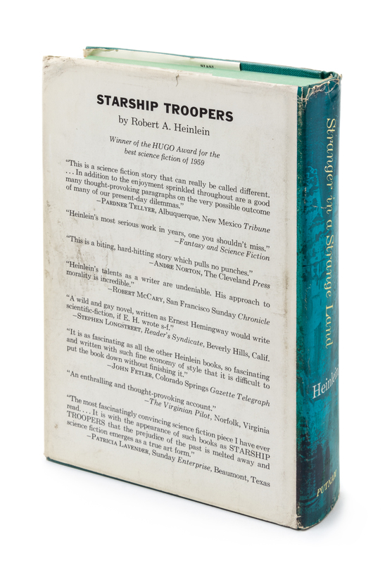 Stranger in a strange land. New York: G. P. Putnam's Sons, 1961. First edition.Green cloth boards (22 cm. tall), with slight bumping to top corners. With full jacket, showing some wear to top of spine and half cm. tear to top of rear panel.The controversial winner of the 1962 Hugo Award for Best Novel, in an incredibly vibrant jacket.