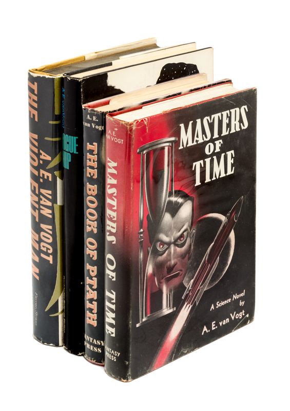 A group of four signed first editions from Canadian-born science fiction author A. E. van Vogt. Consisting of: (1) The book of ptath. Reading, PA: Fantasy Press, 1947. Illustrated by A.J. Donnel. One of 500 signed by van Vogt; (2) Masters of time. Reading, PA: Fantasy Press, 1950. Illustrated by Edd Cartier. One of 500 copies signed and numbered by van Vogt; (3) The violent man. NY: Farrar, Strauss and Cudahy, 1962. Signed by van Vogt on the front endpaper; (4) Rogue ship. NY: Doubleday, 1965. Signed by van Vogt on the front endpaper.