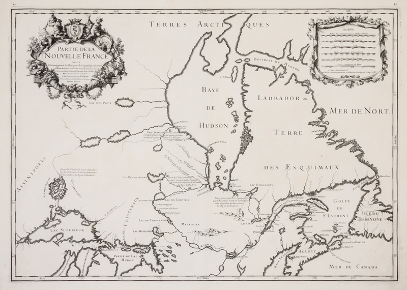Partie de la Nouvelle France. Paris, 1695. Second state.Engraved map (54 x 72 cm., sheet); unframed. Map of Canada by the French cartographer, focusing on his nation's possessions. Offering the first printed information on the geography to the north and west of Lake Superior (Kershaw, p. 158). In this second state, the original 1685 date has been altered in the cartouche.