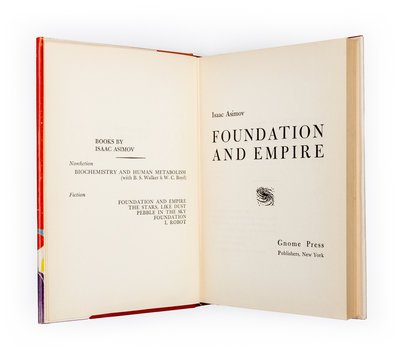 Foundation and empire. New York: Gnome Press, 1952. First edition.Red cloth boards (21 cm. tall), with black-stamped design to front board and black lettering to spine. With price-clipped jacket in first state, showing minor sunning and edge-wear; Very Good. Ownership inscription to front endpaper.