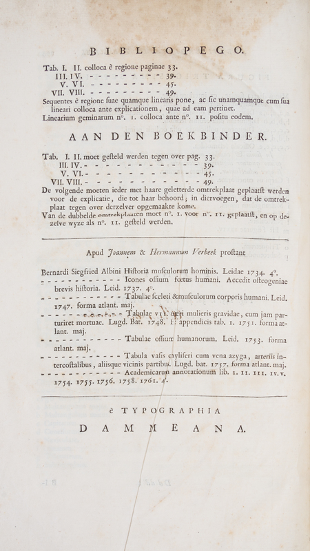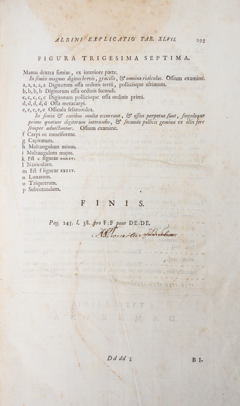 Bernardi Siegfried Albini. Explicatio tabularum anatomicarum. Bartholomaei Eustachii, anatomici summi. Auctor recognovit, castigavit, auxit, denuo edidit. Leiden: Joannem & Hermannum Verbeek, 1761. Second edition.Quarter leather over contemporary boards (44 cm. tall), with expected wear; rebacked, with gilt lettering to spine and seven raised bands. Contents collated as complete. Illustrated with 89 plates; two gatherings of which pull loose from the binding, which is otherwise sound. Seven dated ownership inscriptions, from 1832 until 1956, noted in various hands on front endpaper; undecipherable signature to end of text. With short catalogue for Verbeek publishing house on verso of final leaf. Accompanied by envelope of correspondence, including letter of gift to Dr. Sidney Schulman, famed Chicago neurologist. Plates and text preserved in remarkable condition, with minor soiling to a handful.The accompanying letter of gift provides a comprehensive description: "I had great fun tracking down a book that might be appropriate for you. I wanted to find early anatomical plates of the nervous system, more particularly the brain, but I settled for this 1761 edition of the plates of Eustachius with a text by Albinus (the Latinized name used by a famous professor of anatomy at Leiden; his real name was Bernhard Siegfried Weiss). Eustachius finished these fine copper plates in 1552, but only a few were published during his lifetime and his text was lost for the most part. The plates were found in the early 18th century and given to the current Pope (of all things) and he gave them to his physician who published a 1714 edition in Rome... I have the word of Charles Singer, historian of anatomy and physiology, that if Eustachius had published these plates when he finished them, he would have been recognized with Vesalius and Leonardo as a founder of modern anatomy. His plates are not beautiful, as are those of Vesalius, but in many respects they are more accurate and his plate of the sympathetic nervous system, base of the brain and origin of the cranial nerves is supposed to be particularly fine."