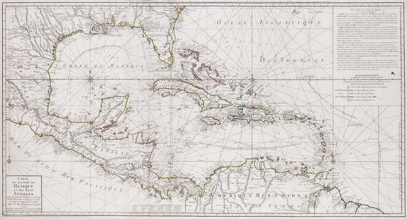 Carte du Golphe du Mexique et des Isles Antilles reduite de la grande carte angloise de Popple. Paris: 1780.Hand-colored engraved map (50 x 93 cm., sight); two joined sheets, depicting the Gulf of Mexico, the Caribbean Islands, Central America, and the northern tip of South America. Possessions of the region are shown via a color-coded key at right, beneath a block of explanatory French text.