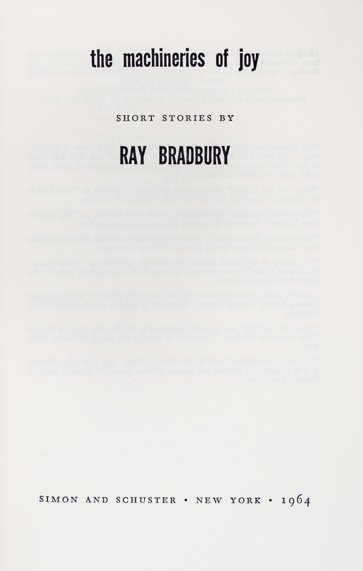 The machineries of joy: short stories. New York: Simon & Schuster, 1964. First edition, signed.Cloth boards (22 cm. tall) in full jacket. Light wear to corners and some scuffing, with usual fading. Signed by Bradbury on front endpaper.