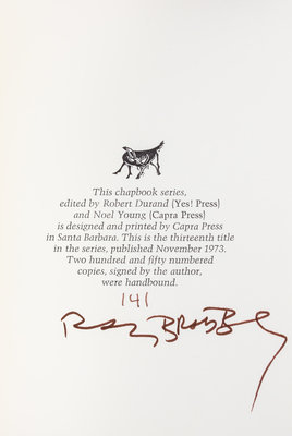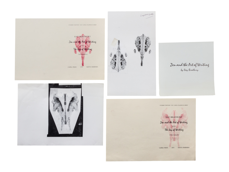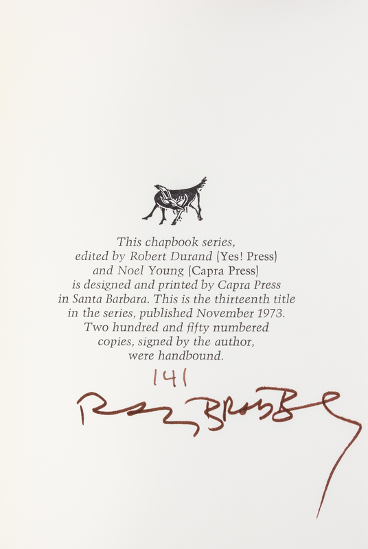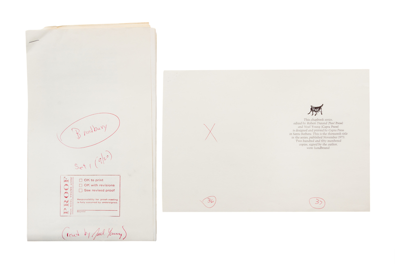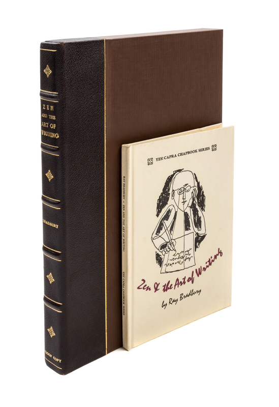 Zen and the art of writing and The joy of writing: two essays. Santa Barbara, CA: Capra Press, 1973. Copy number 141 of 250, signed.Illustrated papered-boards (19 cm. tall). Illustrated with photographic frontispiece and two illustrated title pages. Accompanied by three sets of printer's proofs from Noel Young Printing. all housed in a custom-made clamshell slipcase. Number thirteen in the "Yes! Capra Chapbook Series."