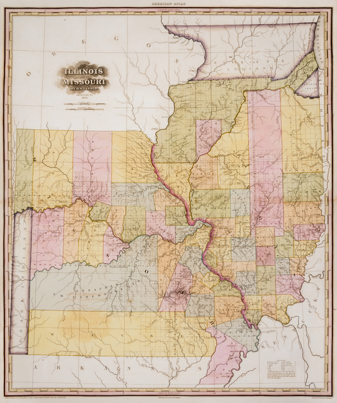 Illinois and Missouri by H. S. Tanner. Improved to 1825. Philadelphia: H. S. Tanner, 1825. Second issue.Copper-engraved map (75 x 60 cm., plate mark); unframed. With full period color. One of the earliest state maps of Illinois and Missouri, in its revised second issue, with significant changes to the mapping of the Mississippi headwaters and an early depiction of the beginnings of the Santa Fe Trail. With a number of new Illinois counties added.
