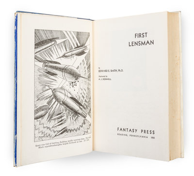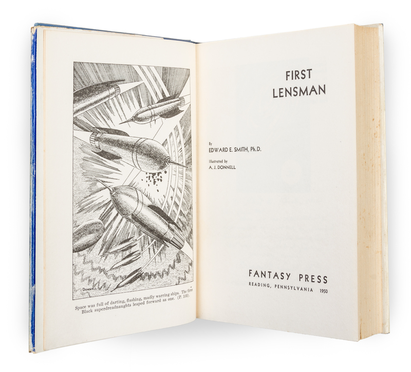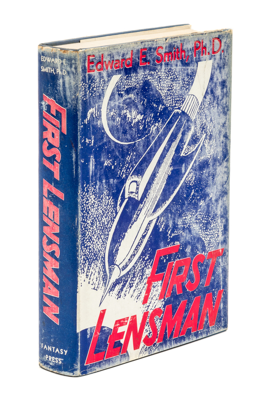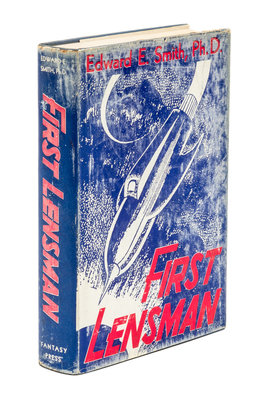First lensman. Reading, PA: The Fantasy Press, 1950. Number 300 of 500 signed copies, from a total edition of 5000, with addtional inscription.Light blue cloth boards (20 cm. tall), with gilt lettering to spine. With full jacket, scuffed with tears mended on verso. With author's presentation inscription to colophon.