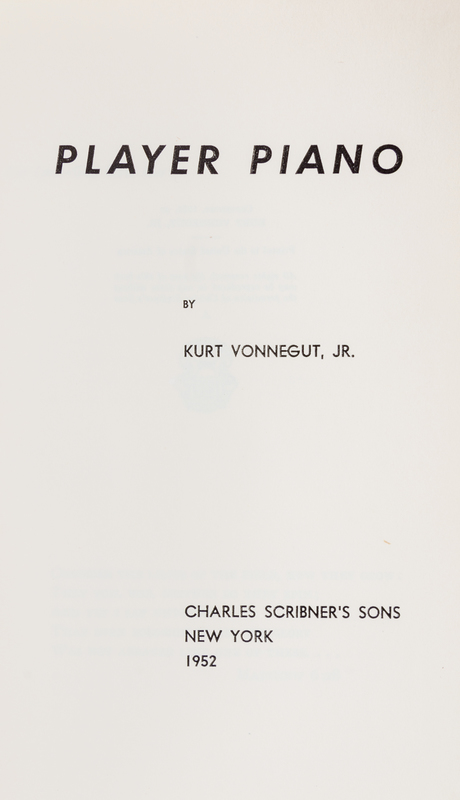 Player piano. New York: Charles Scribner's Sons, 1952. First edition.Green cloth boards (22 cm. tall), with silver lettering to spine. With price-clipped jacket; scuffed and soiled, with mending to verso. Ownership inscription to front endpaper.