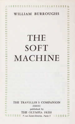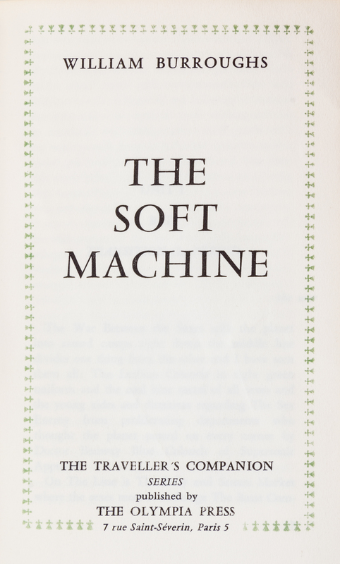 The soft machine. Paris: The Olympia Press, 1961. First edition.Stiff wrappers (18 cm. tall), with jacket designed by Brion Gysin; some sunning to spine. An early airing of the cut-up technique.