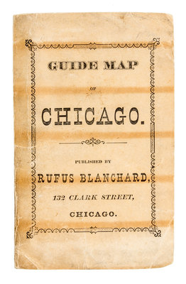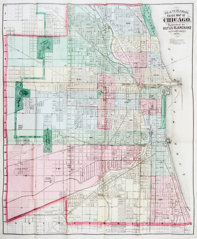 Blanchard's guide map of Chicago. Rufus Blanchard, 1872.Engraved folding pocket-map (56 x 43 cm.), which folds into publisher's lettered paper covers; street guide tipped to inside wrapper (14 pages). With full contemporary hand-coloring.A street map of Chicago, showing the city just one year after the Fire. The limits of the burnt region are outlined by a thin dotted line. The accompanying pamphlet provides index to city's streets via letter-number grid. With city's parks, public buildings, and railroads also identified.