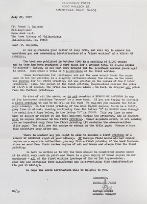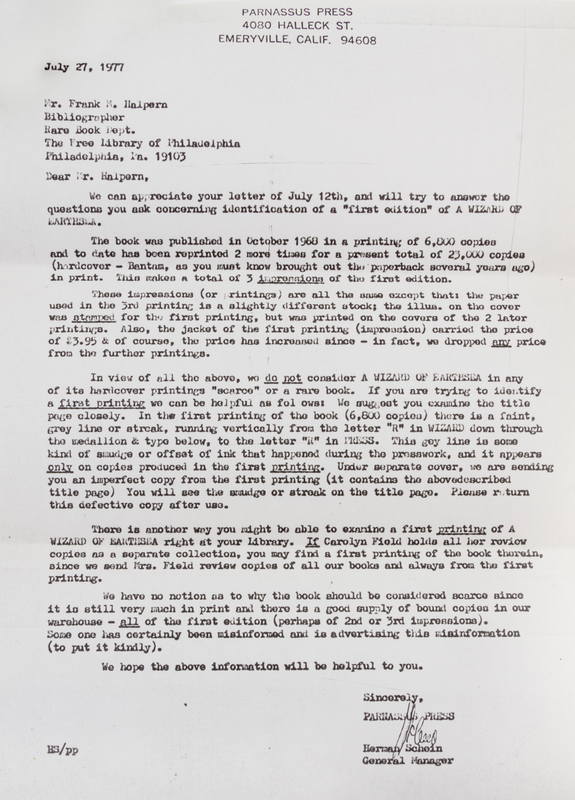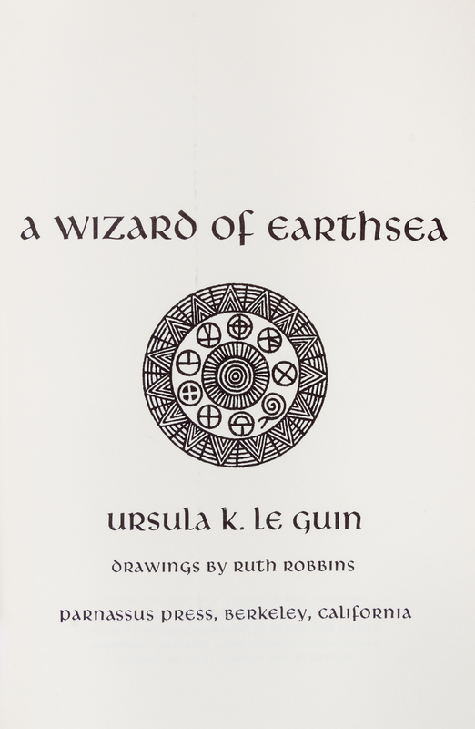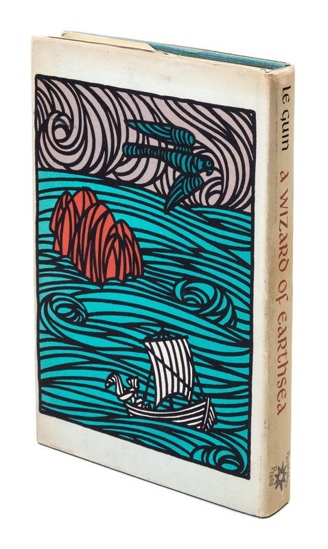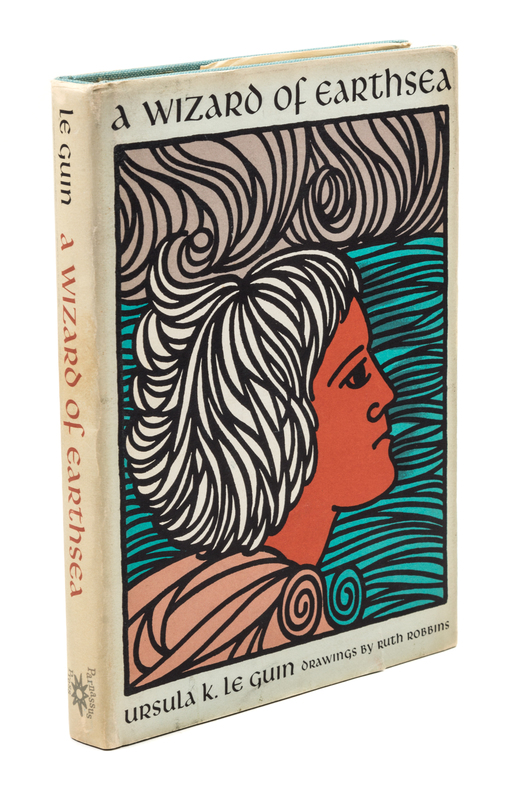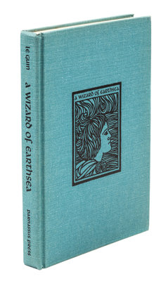 A wizard of Earthsea. Berkeley, CA: Parnassus Press, 1968. Library edition, with bibliographical ephemera included.Decorative cloth boards, corresponding to Currey's description of the Library Edition binding (no priority). With the vertical smudge to the title page, in accordance with Currey's description of the first printing of 6800 copies. The jacket includes the "Library Edition $3.50" in the lower corner, but is clipped at the upper-right of the front flap. With short tear to bottom of front panel and mild sunning; otherwise bright and crisp.Accompanied by authentification letter from pioneering bibliographer L. W. Currey, along with a photocopy of a letter from Parnassus Press confirming first printing points.