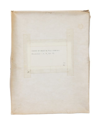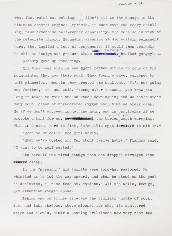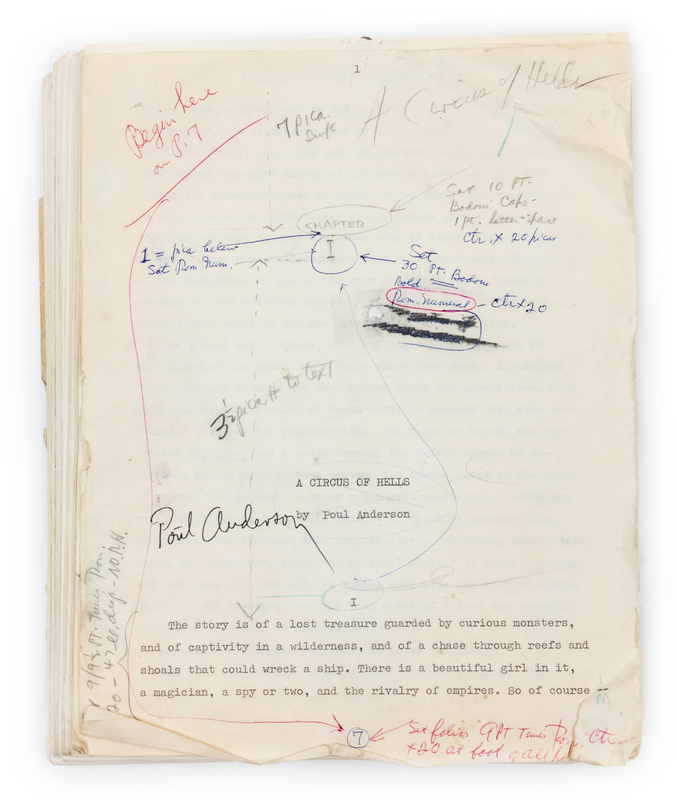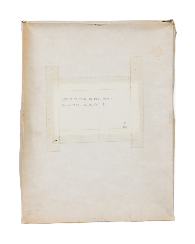 A heavily annotated proof copy of the 1971 work Circus of hells. With 216 typescript pages, heavily annotated, by what appear to be multiple hands (in multiple inks), in regards to both content and layout. Preserved in a simple cardboard box with label affixed to top associating this "manuscript" in some regard with the S. F. Convention of 1971.