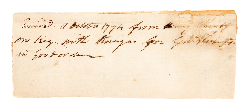 In unknown hand. A manuscript receipt, dated October 11, 1794, regarding a keg of vinegar for "General Washington." (20 by 8 cm.), with torn corner containing the top half of the word "Washington;" lightly chipped at left margin, not effecting text. Through President at the time, Washington was often referred to as General.