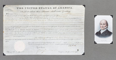 Partially printed document signed ("J.Q. Adams") as President, one page, on engraved vellum with embossed seal affixed to lower left; Washington, April 15th, 1825. Granting William Carpenter of Sangamon County Illinois 80 acres. Countersigned by George Graham as ("Geo. Graham") as Commissioner of the General Land Office. Matted and framed with portrait. Fading to seal, with toning to velllum along top edge; hole at lower right and ink lightly faded.