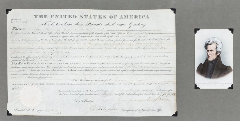 Partially printed document signed ("Andrew Jackson") as President; Washington, November 11th, 1830. One page, on engraved vellum, matted and framed (39 x 24.5 cm sight, 63.5 x 35.5 cm overall), accompanied by 9 x 14 cm color portrait. Embossed Presidential seal faded, but firmly affixed to lower left; toning to vellum, with ink lightly faded. Granting Gershom Jayne of Sangamon County Illinois 80 acres. Countersigned by Elijah Hayward as Commissioner of the General Land Office.