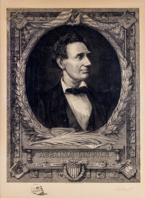 With malice toward none, with charity for all. Philadelphia, 1908. Large portrait etching of Lincoln, surrounded by 36 small vignettes identifying the States of the Union. With a remarque of Lincoln's life mask in the left margin. Unframed. Signed by the artist in pencil at lower right. Matted. Together with two unframed Lincoln engravings by Thomas Johnson. (1) Untitled Lincoln portrait copyrighted and published by Dodd Mead & Company, New York, 1899. Signed by the artist in pencil. Paper toned; small losses to corners. (2) Untitled portrait of Lincoln signed in plate by the artist. (68 x 50 cm., largest)