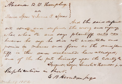 Legal document in Lincoln's hand dated March 17, 1852. Matted (20 x 14 cm., sight; 31 x 26 cm., overall); light foxing and staining on left edge, not effecting text.