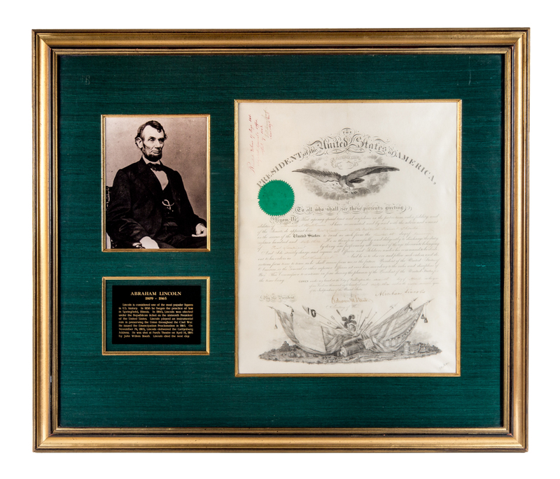 Partially printed document signed ("Abraham Lincoln") on engraved vellum; Washington, April 7, 1863. Framed and matted (38 x 47 cm. sight, 75 x 64 cm. overall), with fascimile photograph of Lincoln (18 cm. x 23 cm) and engraved plaque. Embossed Presidential seal affixed upper left. Light toning to vellum, light fading to ink; one bisecting vertical fold, four horizontal folds, none effecting text.Appointment of Merrill N. Hutchinson as First Lieutenant of the Eighteenth Regiment of Infantry. Countersigned by Edwin M. Stanton as Secretary of War, and signed as recorded by E.D. Townsend Assistant (and future) Adjutant General of the U.S. Army.