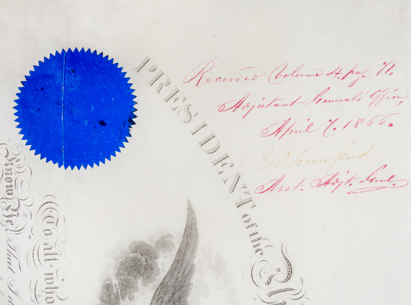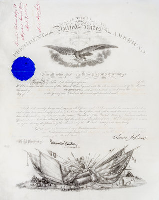 Partially printed document signed ("Andrew Johnson"), on engraved vellum, with embossed seal affixed upper left. Washington, April 7, 1866. Appointment of John H. King as Captain in the First Regiment of Infantry. Countersigned by Edwin Stanton as Secretary of War.Partially printed document with stamped signature ("Andrew Johnson") on vellum. With engraved head- and tail-piece, embossed presidential seal affixed upper left. Washington, April 7, 1866. Appointment of John H. King as Brevet Major General. Countersigned with stamp of Edwin Stanton as Secretary of War; signed as received by E.D. Townsend, Assistant (and future) Adjutant General of the U.S. Army. 40 x 50 cm; one bisecting vertical fold, six horizontal folds; in very good condition. At this point in office, Johnson had stopped signing such commissions, and was using a stamped facsimile. John Haskell King had a long and distinguished career in the United States Army, seeing action in the Seminole War, the Mexican War, and in such important Civil War battles as Shiloh, Stones River (where he was wounded), Chickamauga and in the Atlanta Campaign, where he commanded a division.