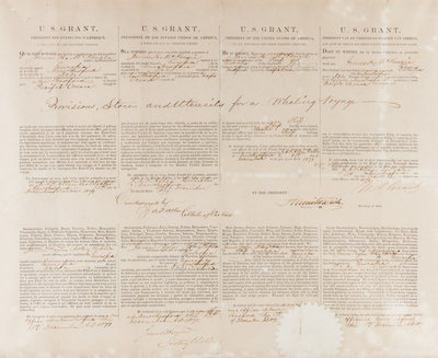 A partially-printed document for a whaling ship, signed by Grant as President, on December 13, 1871. One page document, countersigned by Hamilton Fish as Secretary of State. Framed, 56 x 42 cm. (sight), 65 x 54 cm. (overall). Presidential seal at lower right, faded but firmly affixed; with stamp of New Bedford (MA) Customs Office. With light cockling at lower edge; the sheet is creased from folding.This is a "four language" ship's paper, with printed text in French, Spanish, English, and Dutch, testifying to the fact that the ship was an American vessel. In this case, the Europa, commanded by James H. McKenzie and bound from New Bedford for the Pacific with "Provisions, stores, and utensils for a whaling voyage."