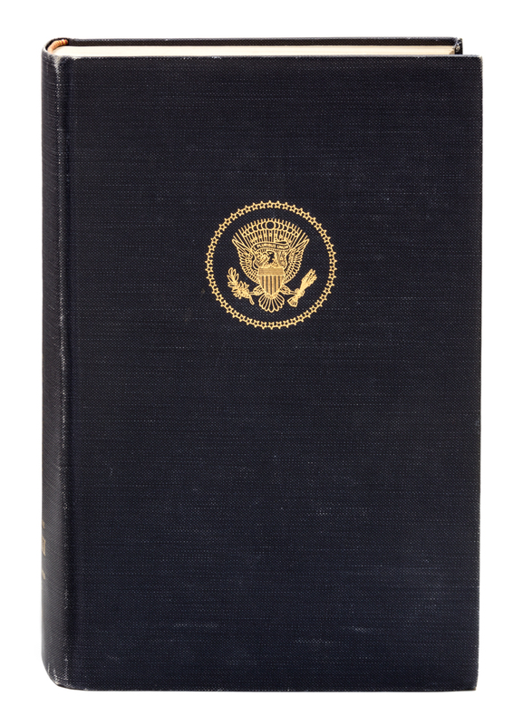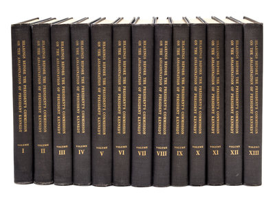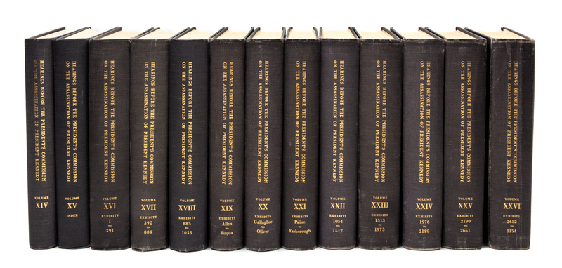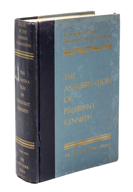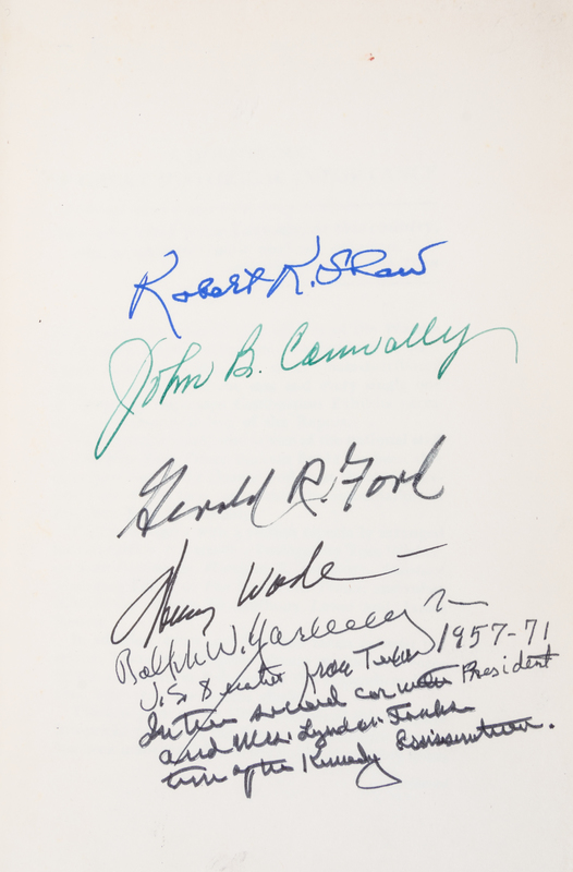 Hearings before the President's Commission on the Assassination of President Kennedy. Washington D.C.: United States Government printing office, 1964. Together with Report of the Warren Commission on the assassination of President Kennedy. New York: McGraw-Hill, 1964; with multiple signatures. 27 volumes total. The one volume abridgement of the 26 volume report, with additional material from The New York Times, is signed on the front endpaper by five figures forever connected with Kennedy's assassination. From top to bottom: Robert R. Shaw, the Chief of Thoracic Surgery at Parkland Memorial Hospital, who worked on Governor Connelly's wounds; John B. Connelly, who as Governor of Texas, was riding in the car with President Kennedy and seriously wounded; Gerald R. Ford, who as a Republican Congressman was part of the Commission that produced this report; "Henry Wade," the District Attorney in Dallas, who would have tried Lee Harvey Oswald for Kennedy's murder; and Ralph W. Yarborough, Senator from Texas who was part of the fateful motorcade in Dallas, riding in the car with Vice-President Lyndon Johnson and Lady Bird.