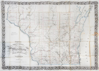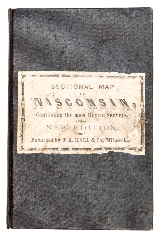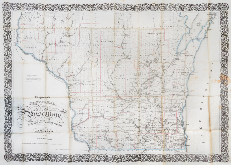 Chapman's sectional map of Wisconsin with the most recent surveys. Milwaukee: J. A. Hall & Co., 1855.Folding pocket-map (23 3/4 x 32.5 cm., sheet), with ornamental border. Folding into publisher's cloth, with letterpress label on upper cover and bookseller's advertisement to front pastedown. Lithographed by F. Mayer of New York, with period hand-coloring in outline.Rare variant of Chapman's sectional map of Wisconsin, first issued in 1853, with J. A. Hall's imprint replacing that of Chapman. Depicts the southern half of the state, with counties, towns, waterways, and railroads (both existing and proposed) identified.