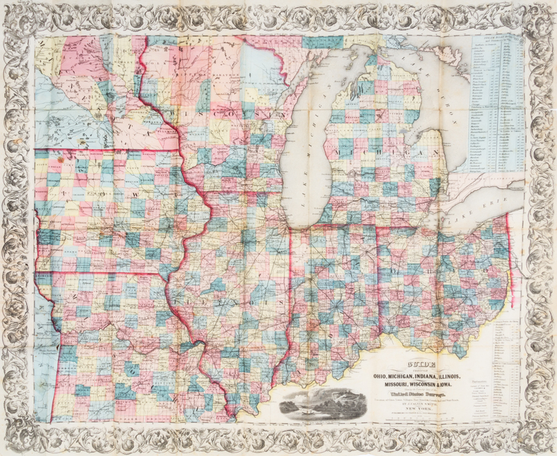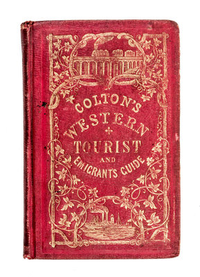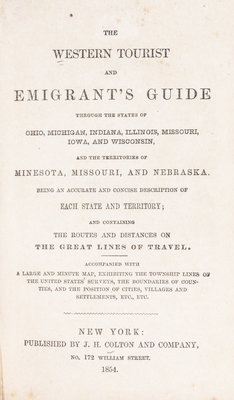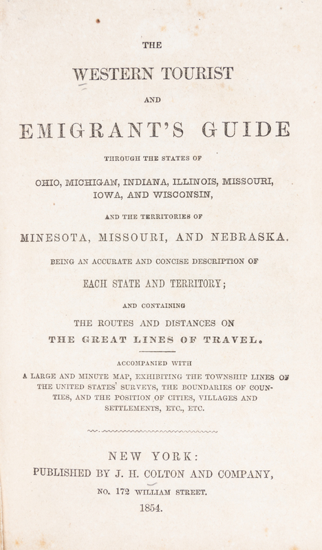 The western tourist and emigrant's guide through the States of Ohio, Michigan, Indiana, Illinois, and Missouri, Iowa and Wisconsin, and the Territories of Minesota [sic.], Missouri, and Nebraska ... Accompanied with a large and minute map. New York: J.H. Colton and Company, 1854 [map dated 1855].Folding pocket map (54x 67 cm., sheet), folds into publisher's red cloth covers; decoratively stamped in blind, with upper cover titled in gilt. 89 pages of text and28 pages of ads mounted to inside wrapper. With full period hand-coloring.Title page revised to account for newly-established Territory of Nebraska and updated throughout to account for development along Midwestern frontier.