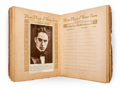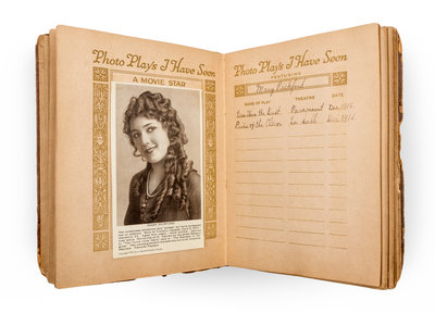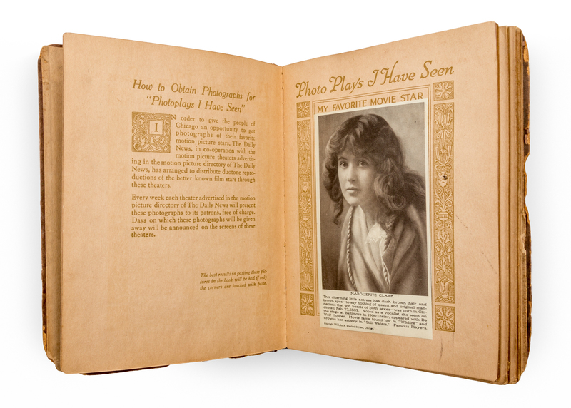 Photo-plays I have seen. New York and Chicago: Ellen Publishing Company, 1915. Stiff papered boards (24 cm. tall), with repair to spine and some wear to corners. A scrapbook allowing early cinema fans to collect photographs of their favorite stars, while documenting which of their "photo-plays" have been viewed. This copy includes 37 tipped duotone reproductions of the images of actors and actresses (to versos), along with manuscript titles of a handful of related films to rectos.
