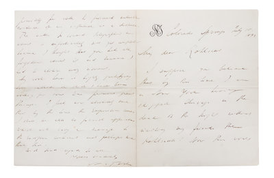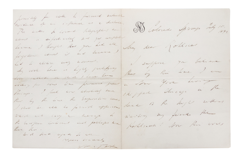 Autograph letter, signed. Bifolium, on Tesla's personal letterhead, dated July 15, 1899.A letter to the Chicago newspaper publisher H. H. Kohlstaat, in which Tesla discusses the recent development of his laboratory in Colorado Springs, his writings on telepathy, his need for money, and the "highly gratifying" nature of his progress. "I feel now absolutely sure that by the time the Exposition comes I shall be able to furnish [an] apparatus which will carry a message to the European Continent and perhaps more than this." An early declaration of Tesla's goal to build the World Wireless System.