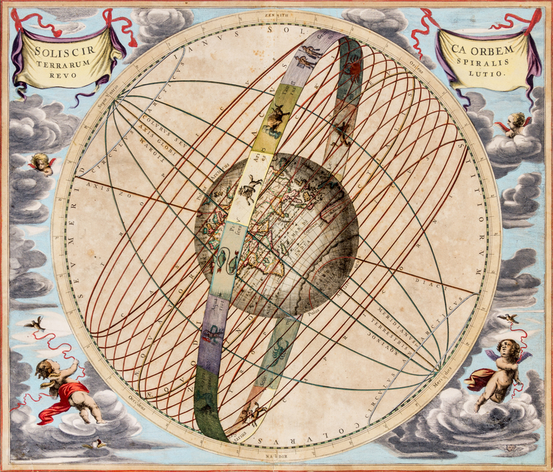 Soliscirca orbem terrarum spiralis revolutio. Amsterdam, 1660.An engraved celestial chart from Cellarius' Harmonia macrocosmica seu atlas universalis et novus. Unframed (42 x 50 cm.); vibrantly hand-colored.