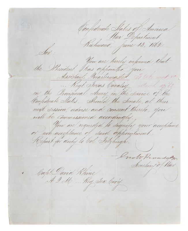 Autograph letter signed by George W. Randolph, as Secretary of War for the Confederate States of America; Richmond, Virginia, June 13, 1862.Notification of President's appointment of Captain David Rhine to Assistant Quartermaster of a Texas Cavalry Regiment, to take rank on March 10, 1862.