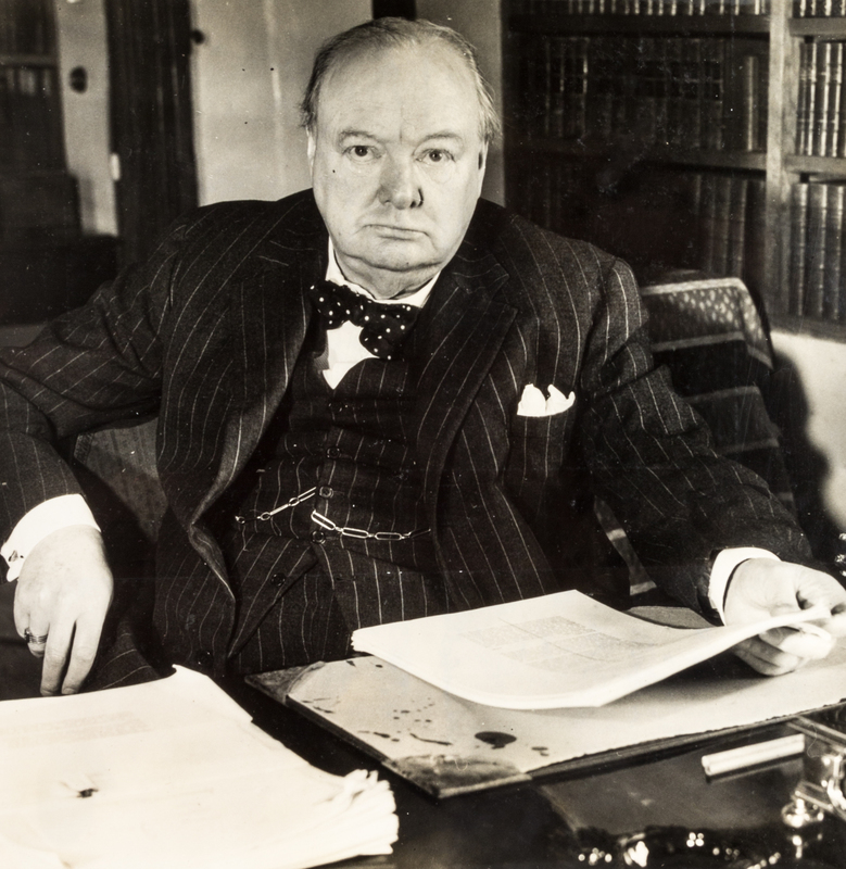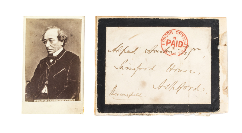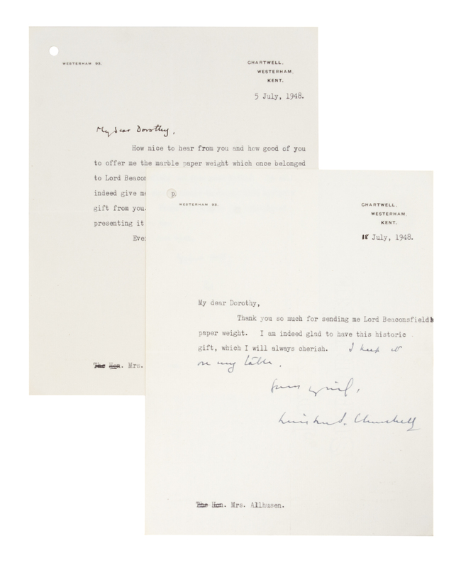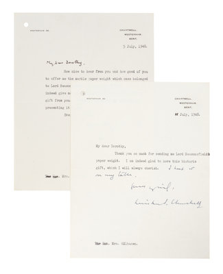 TLs. 1pp on bifolium, date July 18, 1948. Thanking Dorothy for gift of paperweight that once belonged to Lord Beaconsfield. [Together with] possible earlier draft of same letter dated July 5, 1948. [Together with] CDV of Lord Beaconsfield, a card with handwritting and a black and white photograph of Churchill seated at his desk. (5 pieces total)