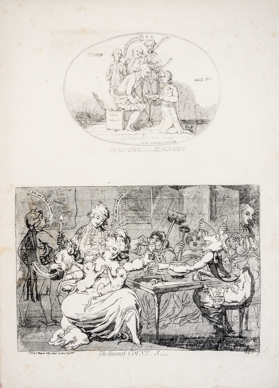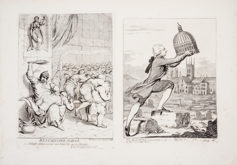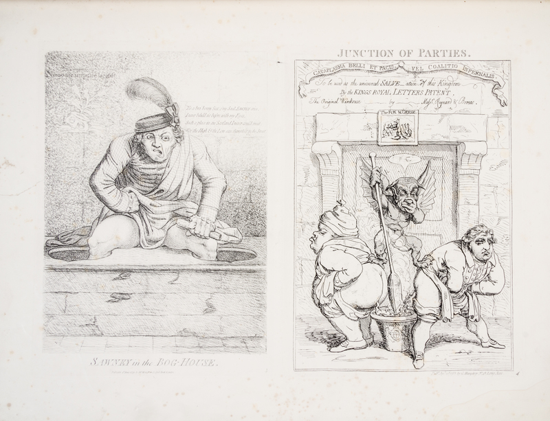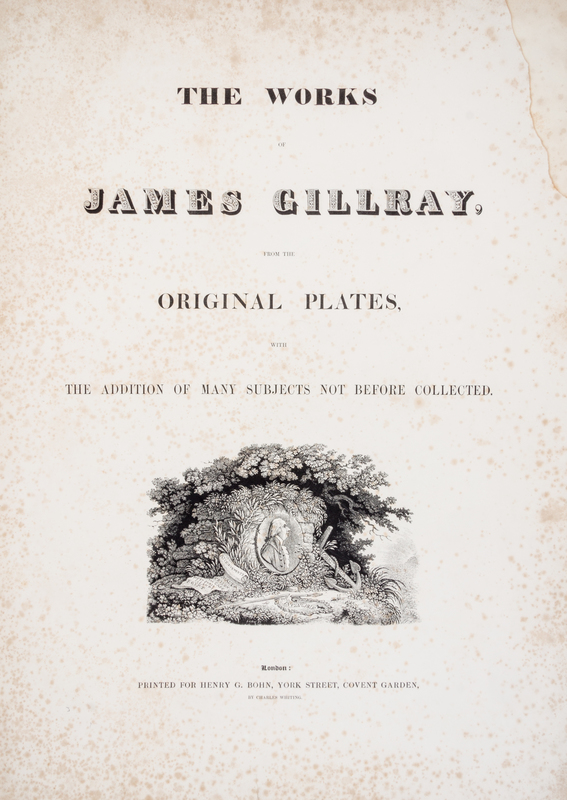The Works of James Gillray from the Original Plates. London: G. Bohn, c. 1849.3/4 leather over marbled boards. With etched frontispiece, engraved title page and numerous engravings throughout.