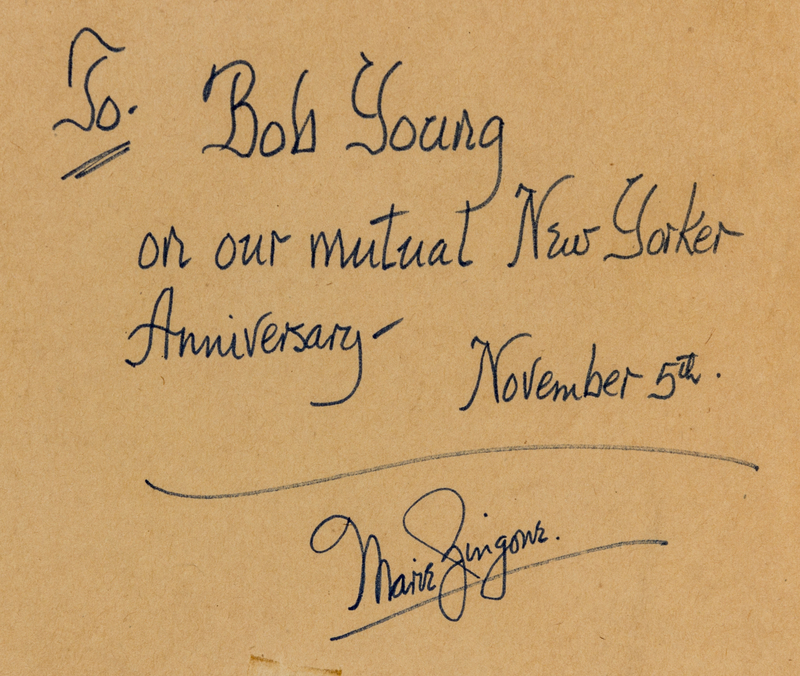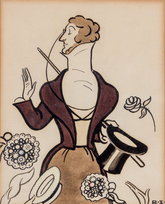 Ink and gouache sketch of Eustache Tilley. Inscription on back paper of frame reads: To Bob Young on our mutual New Yorker Anniversary. November 5th.