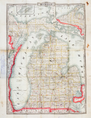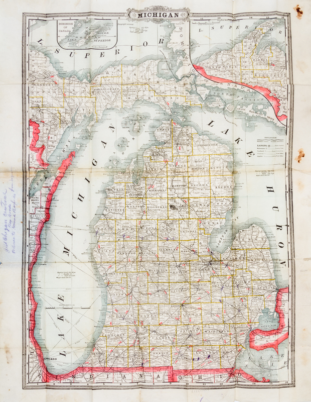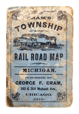 Cram's township and rail road map of Michigan. Chicago: George F. Cram, circa 1890. Folding map (60 x 48 cm., sheet), with 24 page index. Original paper covers worn and discolored. With two insets: Isle Royale in Lake Superior and a map of the upper peninsula. The text describes the routes of the 29 railroad lines that were operating at the time.