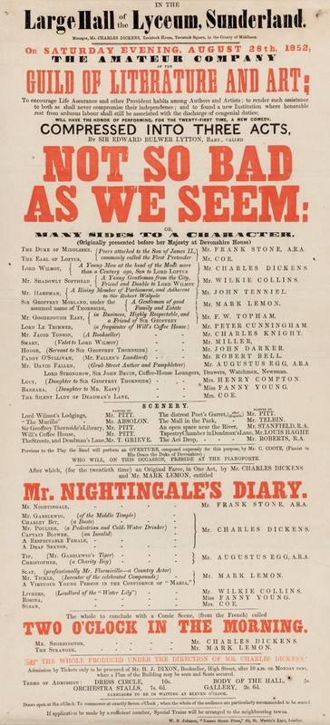 Lyceum poster. Advertisement for the play, Not so Bad as We Seem, managed by Mr. Charles Dickens. August 28th, 1852. Red and black ink on paper. Framed.
