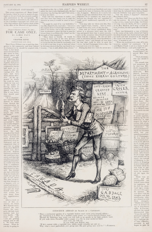 Page from Harper's Weekly dated January 21, 1882. Featuring a caricature of Mark Twain. Framed and matted.