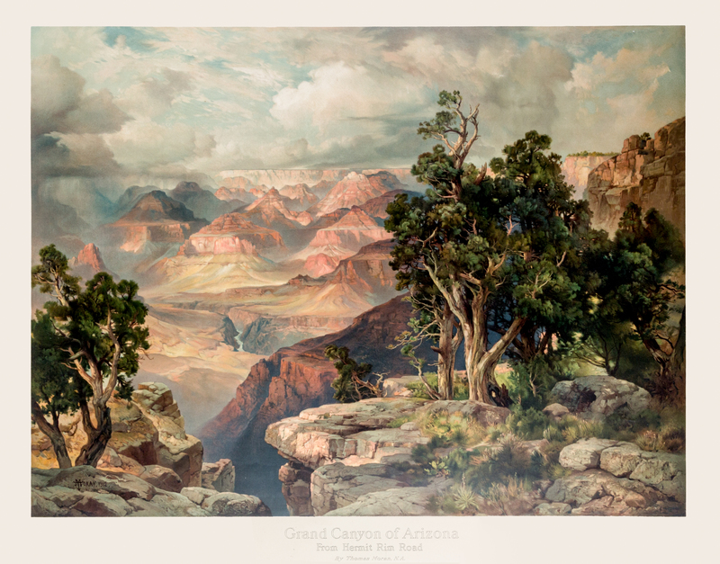 Grand Canyon of Arizona from Hermit Rim Road. New York: Printed by American Lithographic Co., and published by Atchison, Topeka, and Santa Fe Railway System, 1913. Color-printed lithograph (27 x 35 INCHES).This majestic print is the largest and most dramatic of Thomas Moran's printed works. It was published by the Atchison, Topeka, and Santa Fe Railroad in 1912, after the original oil commissioned for (and still owned by) the line. It shows a tremendous sweep of the scenery of the Grand Canyon from the Hermit Rim, with the bright colors of the Canyon shown dramatically against the turbulent sky.Thomas Moran, famous for his superb landscapes of the West, first painted the Grand Canyon in 1873 when he painted his "Chasm of the Colorado," which he sold to Congress the following year. In 1892 he visited the Canyon as a guest of the Santa Fe Railroad, whose line now brought tourists within easy reach, and painted a large canvas for the line in return for a free trip. The SFRR completed a spur line to the rim in 1901, and consistently sponsored "artist's excursions" there from 1901 to 1912, as well as purchasing paintings for promotional efforts. In 1912 the railroad capped twenty years of association with Moran by commissioning this picture and producing this large chromolithograph.Almost all copies of this Moran print were soon trimmed and framed, and distributed by the SFRR as promotional gifts. Few of these have survived, generally being badly framed, usually without glass, and displayed in poor conditions. A small number remained in the archives of the railroad, and so have retained their untrimmed and pristine state. The present copy is in this uncirculated condition.