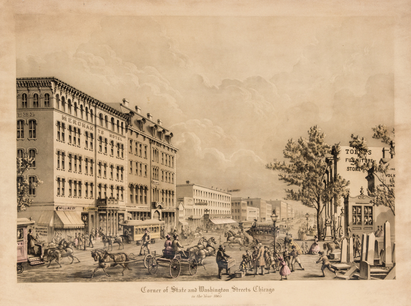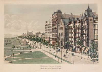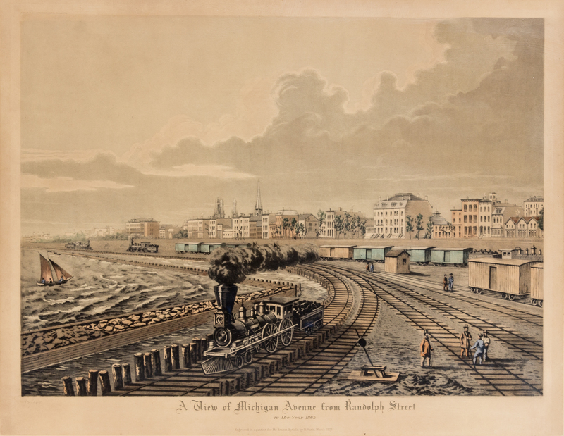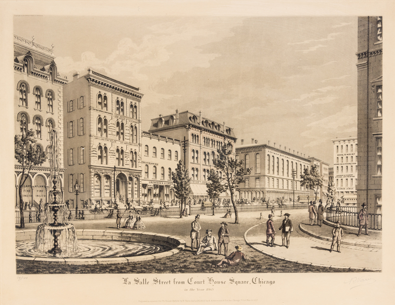 A group of five prints depicting nineteenth century scenes of Chicago. All published by A. Ackermann & Sons, 1927-1931. Engraved acquatints. Dimensions of largest being (55 x 67 cm., sight); all matted and framed. Each signed by Varin at bottom right margin.Prints include: (1) Michigan Avenue looking south at Van Buren Street, 1889; (2) Corner of State and Washington Streets, Chicago; (3) A view from Michigan Avenue from Randolph Street; (4) Chicago in 1831 with a view of Fort Dearborn and John Kinze's Residence; and (5) La Salle Street from Court House Square, Chicago.