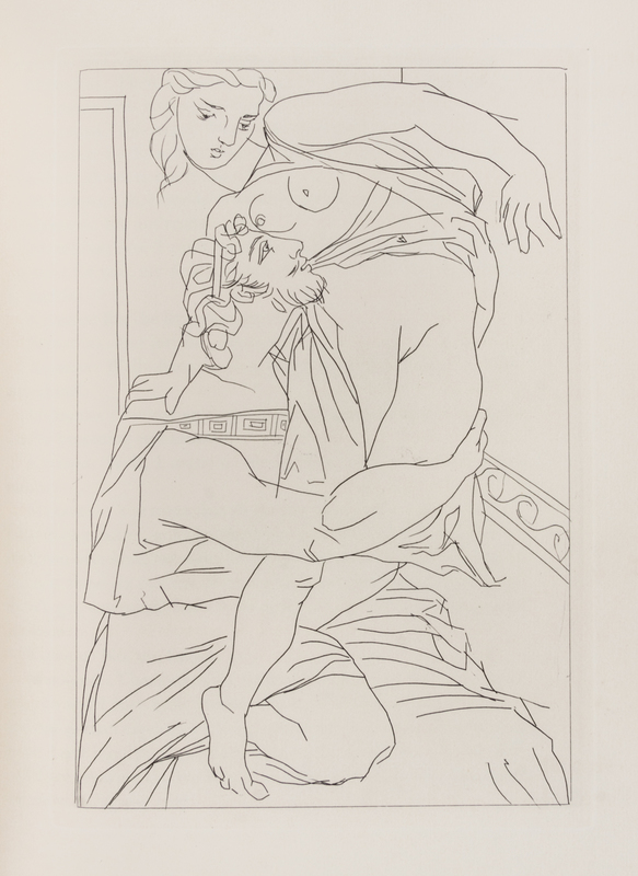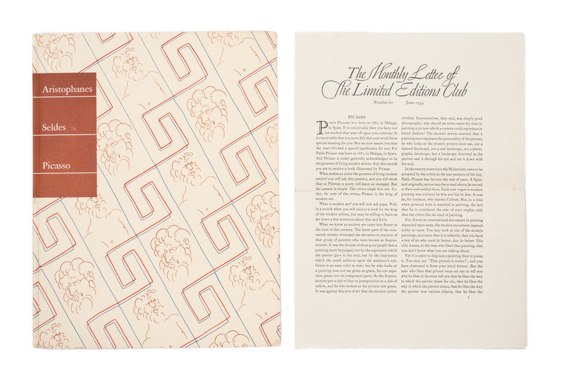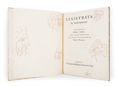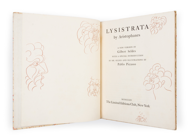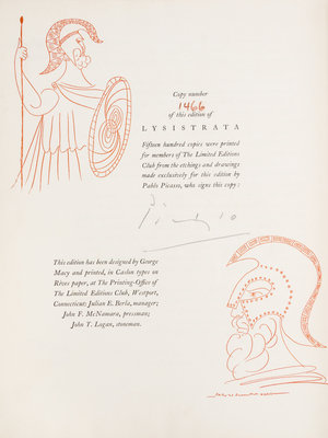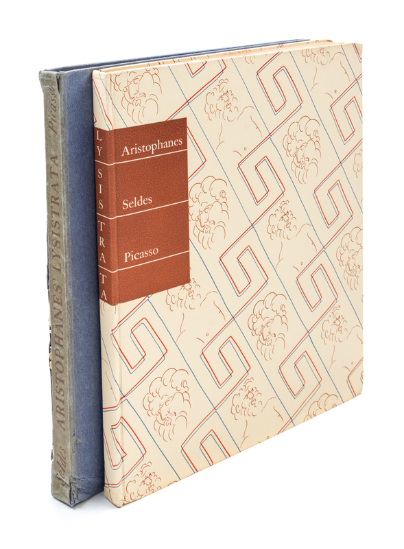 Lysistrata. Limited Editions Club, 1934. Number 1466 of 1500 copies. Signed.Illustrated papered boards, with paper label wrapping around spine onto both boards. Accompanied by papered board "jacket," lettered on spine and worn at hinges, as well as the blue carboard slipcase, also quite worn. Signed by Picasso on colophon, with six original etchings and numerous drawings throughout. Accompanied by LEC newsletter (no. 61) from June 1934.Present in its entirety.