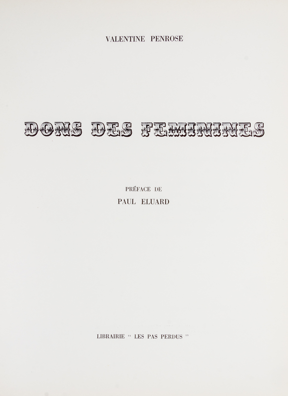 Dons des feminines. Paris: Librairie "Les Pas Perdu," 1951. Copy number 85 of 350, from a total edition of 400.Wrappers over stiff boards (34 cam. tall); with shallow incision to centre of front panel. Original glassine included. Illustrated throughout with black-and-white collages by Penrose (30 leaves, unpaginated), with short preface by Paul Eluard. Accompanied by an untilted etching by Picasso, on toned paper; loose and numbered in pencil (85/350).