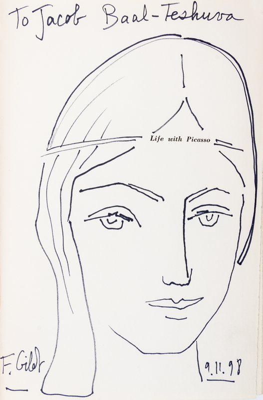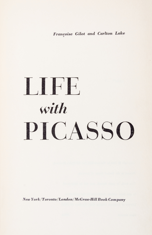 Life with Picasso. New York: McGraw-Hill Book Company, 1964. First edition; presentation copy.Tan cloth boards (24 cm. tall), with brown lettering to spine. With full jacket; chipped, with a number of tears. With ink portrait by Gilot of a female figure on half-title page, cleverly incorporating the book's title into a head-band. With a presentation inscription to art critic and curator Jacob Baal-Teshuva, dated 9-11-98.