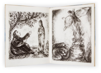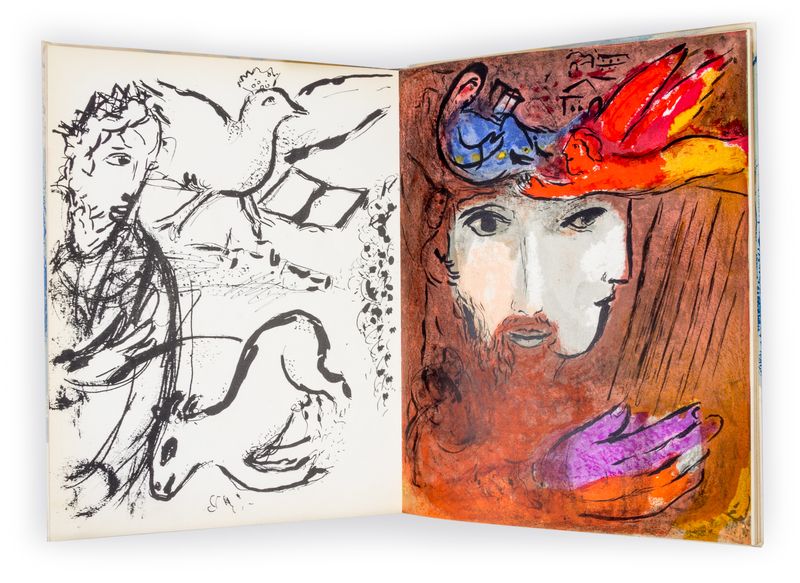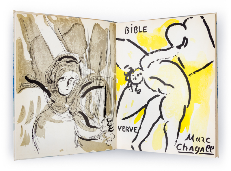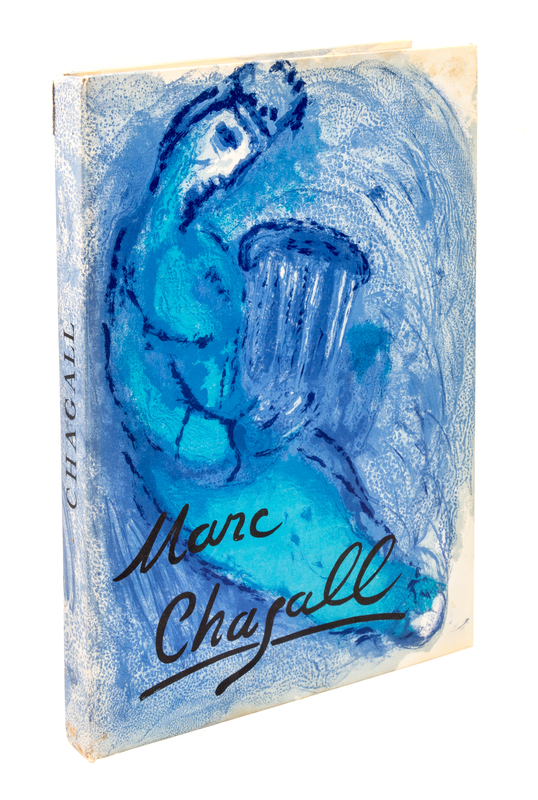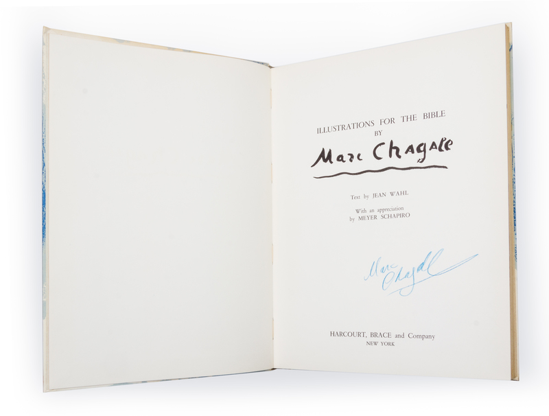 Illustrations for the Bible. New York: Harcourt Brace and Company, 1956. First American edition. Signed.Papered boards (36 cm. tall), without jacket. With 17 lithographs in color, including the cover, 12 lithographs in black, and 105 heliogravures in black. Signed by Chagall on the title page.