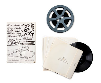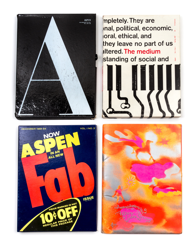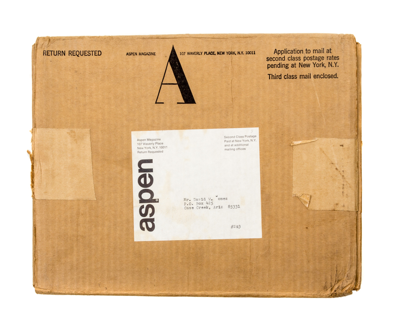 A remarkably-preserved collection of one of the earlest "3 dimensional magazines," published by Phyllis Johnson, featuring contributions from a who's who of twentieth century (post-)modernism: Andy Warhol, John Cage, Hans Richter, Samuel Beckett, Marshall McLuhan, Timothy Leary, J. G. Ballard, Roland Barthes, and Susan Sontag. Lacking numbers 7 and 8. All of the issues present have been collated as complete and in fine condition, with only the first number showing some wear to the box edges and number 6a showing wear to its illustrated envelope. Numbers 2 and the double number (5+6) are accompanied by their original shipping packages; providing further context to this production. The infamous number 3, designed by Andy Warhol, is preserved in particularly fine condition.