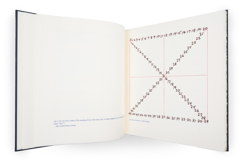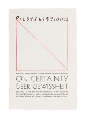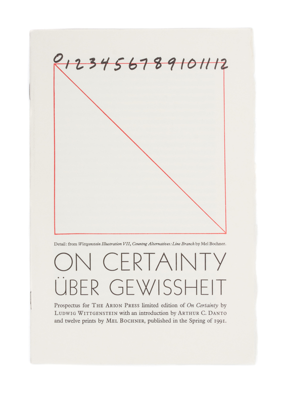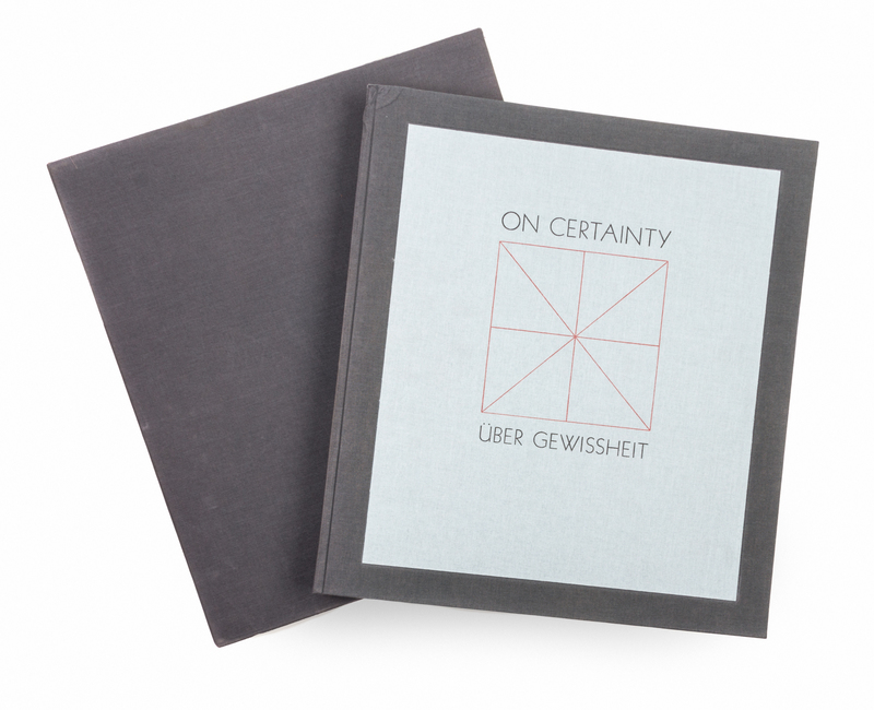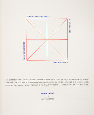 On Certainty. San Francisco: The Arion Pess, 1991. Number 292 of 300 copies.Original tall cloth boards with matching slipcase. With 12 illustrations by Mel Bochner in red and black. Text in German and English. Includes prospectus.