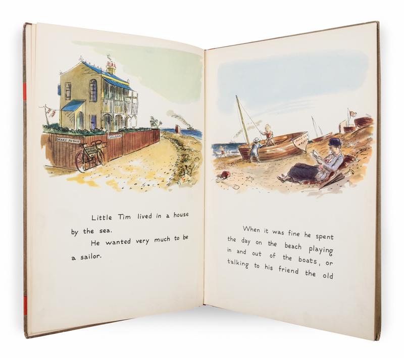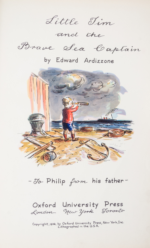 Little Tim and the brave sea captain. New York: Oxford University Press, 1936. First edition.Illustrated boards (33 cm. tall), with minor soiling and edge-wear. With 31 pages of color-illustrated text, printed in unorthodox fashion, with versos and rectos following each page left blank; producing alternating spreads of images and blanks.