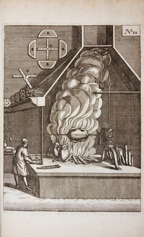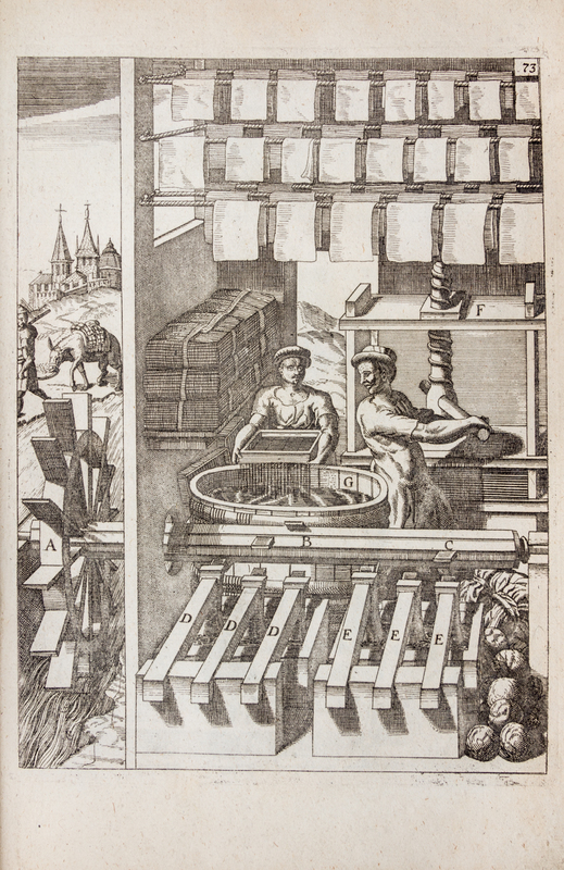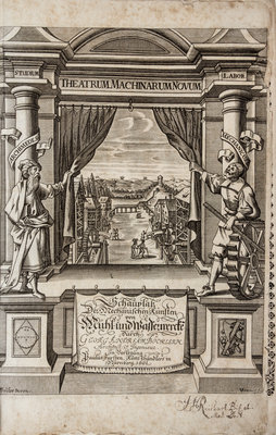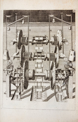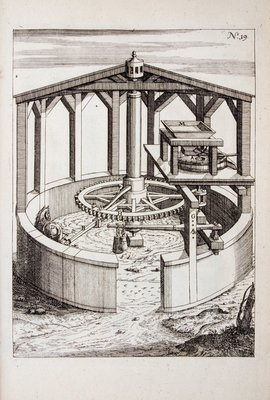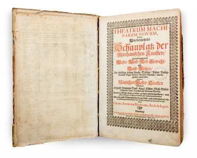 Theatrum machinarum novum. Nuremberg, 1673. Second edition.Contemporary binding of three-quarter vellum over boards (34 cm. tall), with spine lifted and twisting at top. Manuscript titles to spine. With contemporary signature to engraved title page and twentieth century stamp of Chicago collector. Engraved title page loose; table of contents trimmed. Contents collated as complete: 44 pages, followed by 154 plates. Browning to final few plates, otherwise plates are remarkably bright.Baroque machines depicted include: windmills, paper mills, a roasting-spit, and a fire-engine.